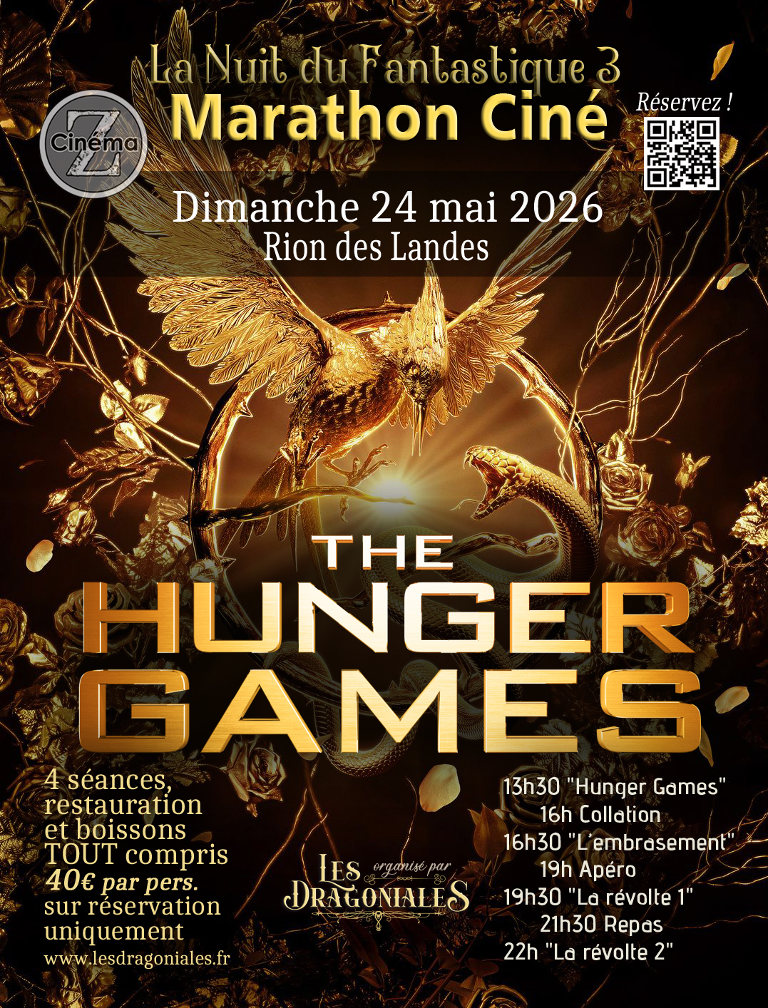 En collaboration avec le Cinéma Z nous vous proposons un véritable marathon du cinéma fantastique avec la QUADRILOGIE de HUNGER GAMES (version française) le Dimanche 24 mai à partir de 13h30 Pas de panique restauration et boissons sont comprises dans le PACK à chaque entracte !!!!